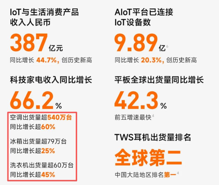 在家电领域,小米空调半年出货量超540万台,同比增长超过60%,已站稳市场第四位置并直逼前三;冰箱出货量超79万台,同比增长超25%;洗衣机出货量超60万台,同比增长超45%。