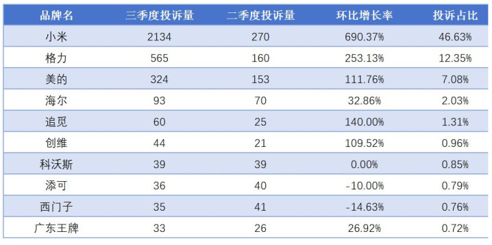 从增长趋势来看,小米的投诉量从二季度的270件激增至三季度的2134件,环比增长率高达690.37%,投诉占比也从二季度的较低水平飙升至46.63%。相比之下,格力环比增长253.13%,美的增长111.76%,小米的增长势头远超行业其他品牌。