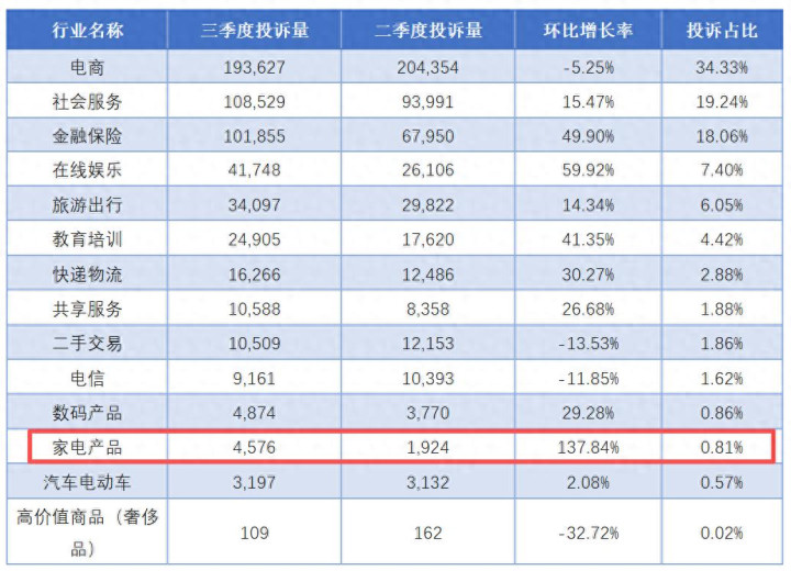 根据《2025年三季度消费保投诉分析报告》显示,2025年三季度消费保平台累计收到消费者投诉56.41万件,环比增长14.61%。在家电产品行业投诉中,虽然总投诉量仅为4,576件,但环比增幅高达137.84%,成为投诉增长最快的领域之一。